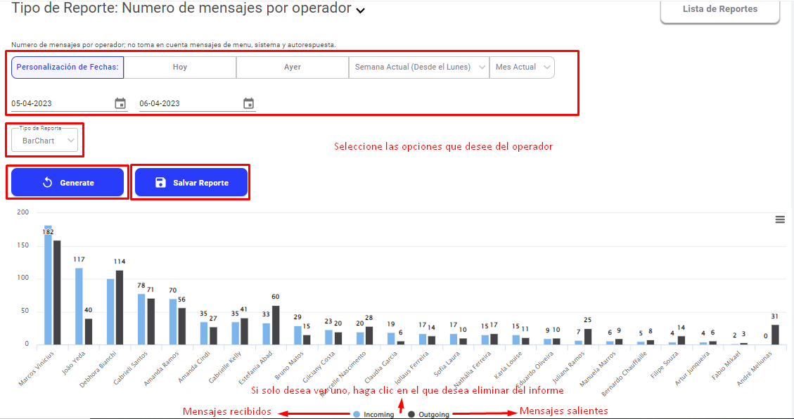 En este informe, podemos conocer el promedio de mensajes recibidos y enviados por cada operador. Para generar este informe, es necesario elegir una fecha concreta, después seleccionar la herramienta sobre la que se informará en el informe y, a continuación, generarlo. Además, si desea guardarlo para volver a consultarlo más tarde, debe hacer clic en "Guardar en mis informes":
