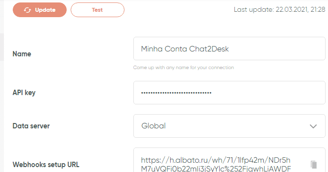 Na primeira aba, temos o Acesso, que descreve o Nome da conta, a Api (em formato de senha), o servidor e a URL do Webhook (que abordaremos mais tarde)! Lembre-se que todas são editáveis, apenas Clique em Save(salvar) e em test para garantir que tudo está nos conformes!